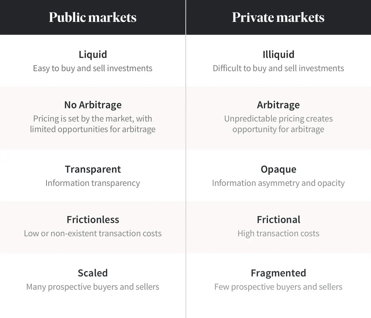 While these market dynamics may seem unfavorable, they are actually potentially more favorable to investors. That’s because whereas the market sets prices in the efficient public market, there’s room for negotiation between the buyer and seller in the inefficient private market. With fewer buyers and sellers participating in the market, and with information unequally shared, the market doesn’t necessarily set the price of the asset, giving investors a greater chance to “beat the market” in a way that isn’t possible to do on a consistent basis in the public market.