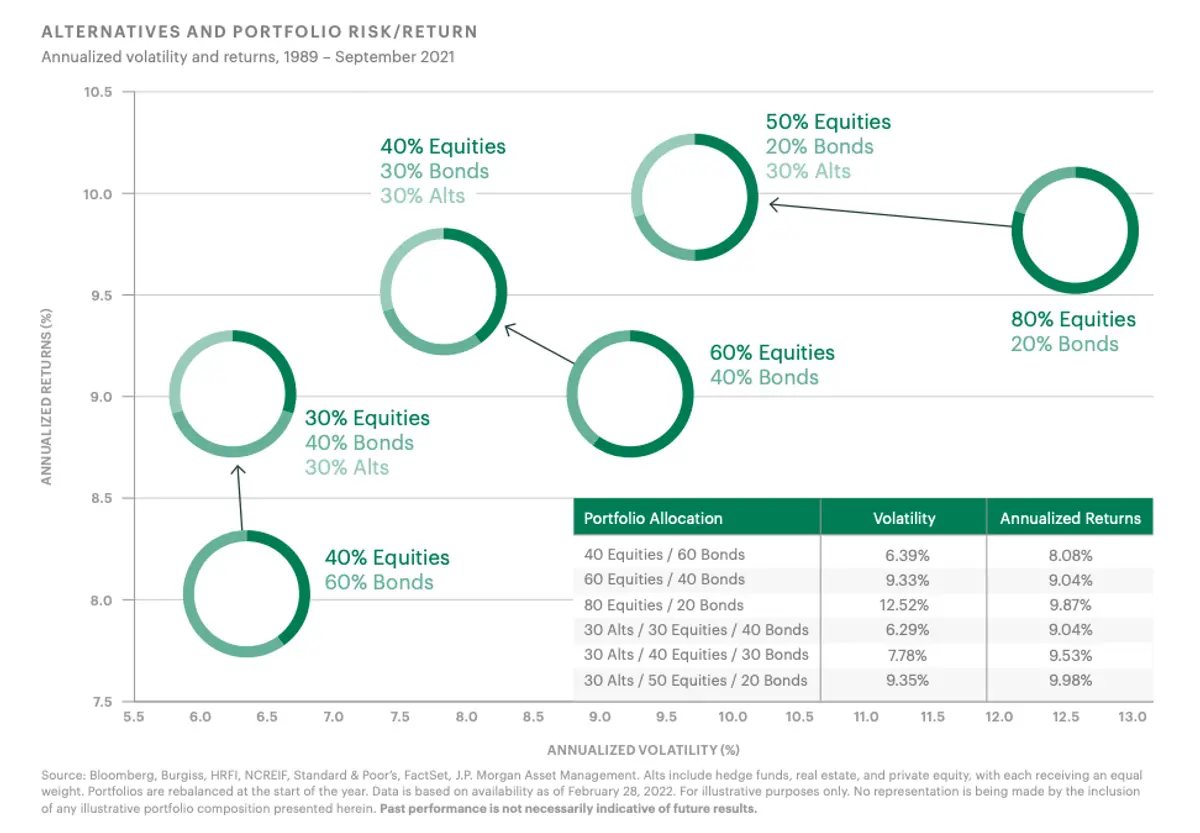 The “30+ rule” is one of the most useful and important pieces of financial insight for investors today. It’s simple: more than 20 years of data show that an individual portfolio that’s at least 30% invested in “alternative assets” — like private real estate — have handily outperformed portfolios of just stocks and bonds. Data collected from Bloomberg, S&P, J.P Morgan, and more, make it clear:1 traditional stock and bond portfolios deliver lower returns and have higher volatility than portfolios that introduce alternatives like real estate and venture capital.