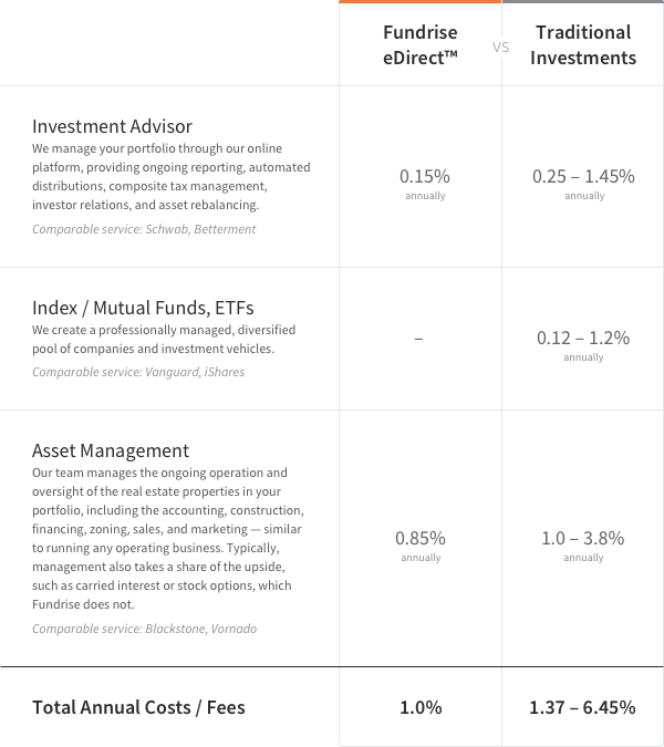 Only in a skin-deep analysis does Vanguard appear to offer a lower-cost option than Fundrise. When analyzed more thoroughly, an analysis of Vanguard reveals a broad swath of fees and costs innate in the public market investment system, which are absent from the Fundrise investment model.