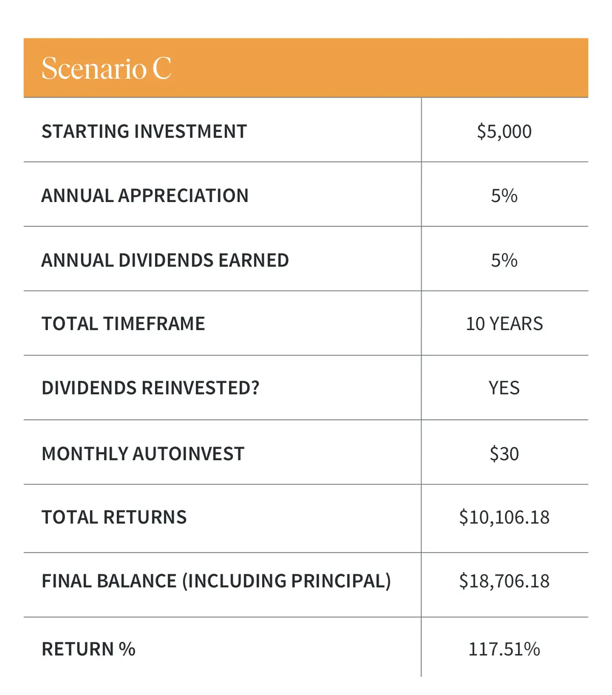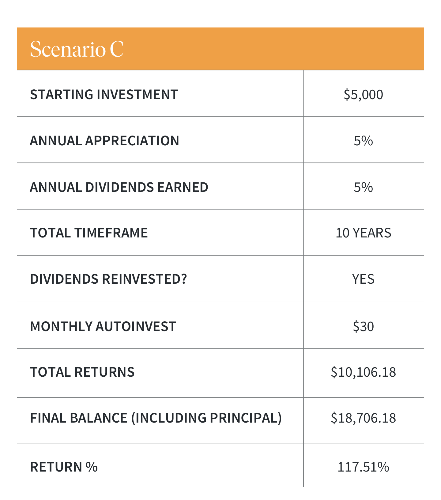 Last in our 10-year time horizon scenarios, we have a variation that introduces monthly autoinvest, a recurring amount automatically added to the principal — here, $30 (or a total of $3,600 over 10 years). While $30 per month isn’t a particularly large sum, its ultimate impact over the 10 year test period is substantial: Scenario C results in a total return of about $10,106, equal to roughly 117%.