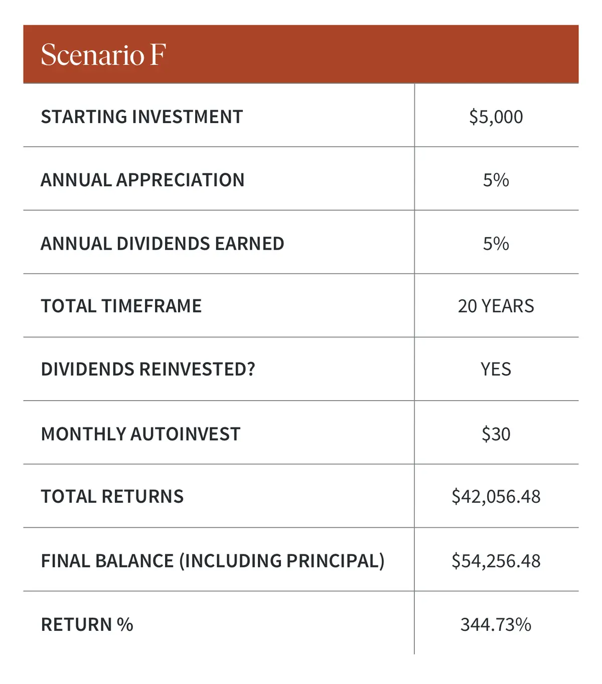 And lastly, reactivating $30 monthly autoinvest over 20 years, we see a starting investment of $5,000 grow into over $40k, albeit, once again, with a lower total return than in Scenario E. With what amounts to a $30 per month maintenance expense — the total principal becomes $12,200 by the end of the 20 year period — adding autoinvest to the power of dividend reinvestment and the explosive momentum of compound growth, the simulated investor here nurtures their initial funds into an amount truly transformative.