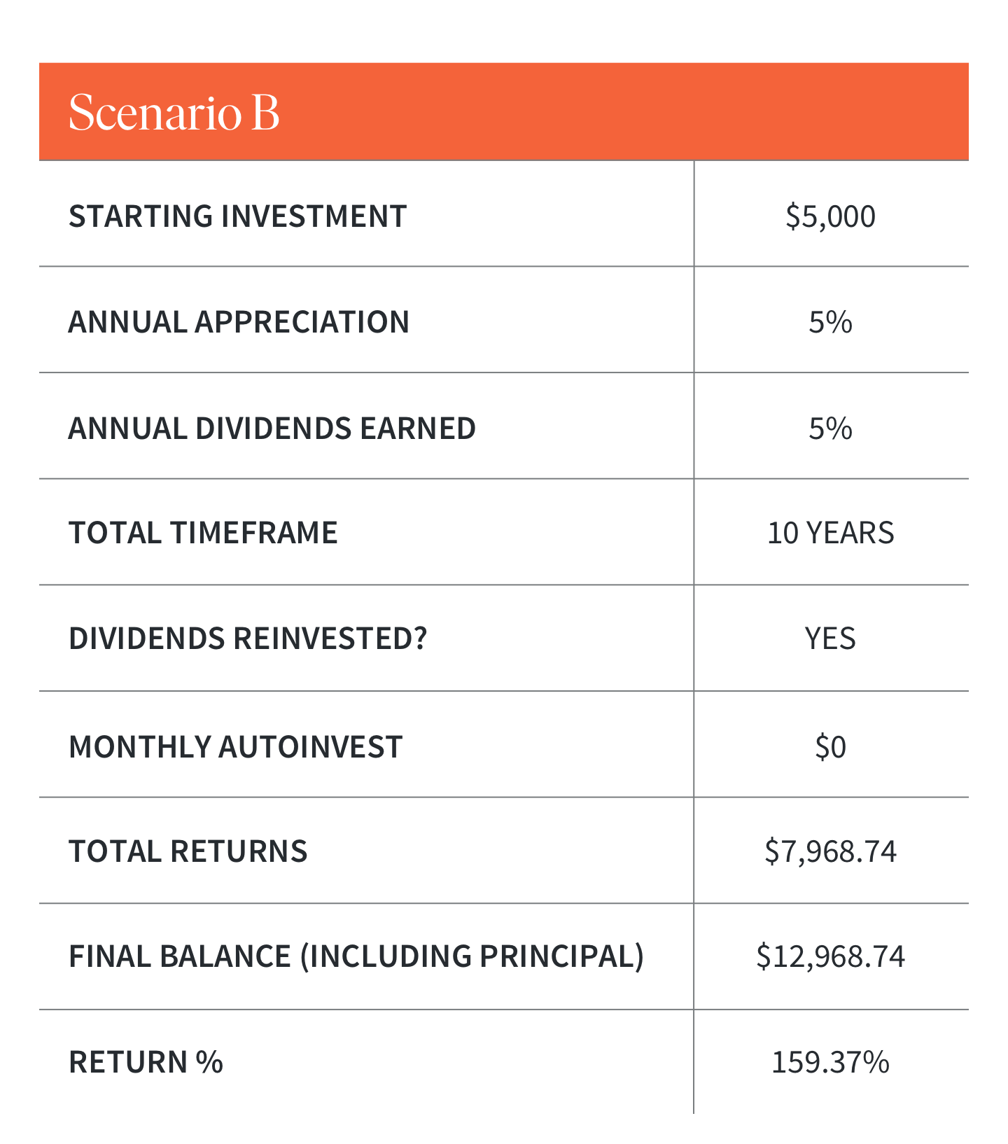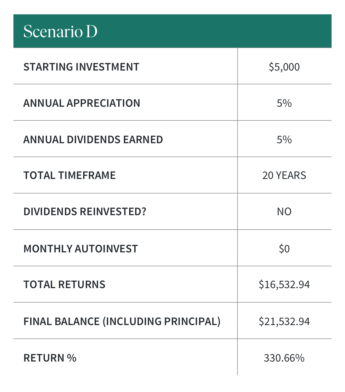 Back to the simplest example, with no dividend reinvestment — where only half of the annual returns have the opportunity to fuel compound growth. The result? A 164% increase in total returns over the analogue 10-year example, Scenario A — far more than double, despite only doubling the amount of time required. The extra work required? None: only the initial $5,000 investment.