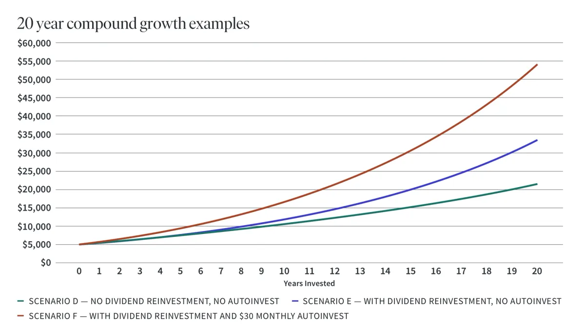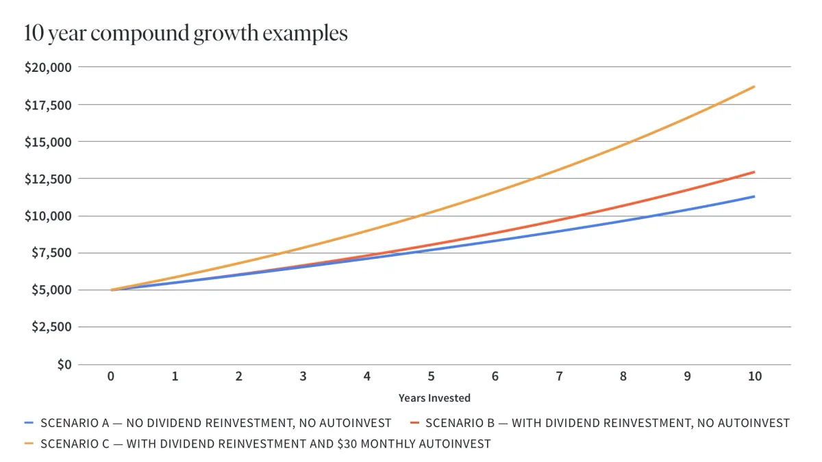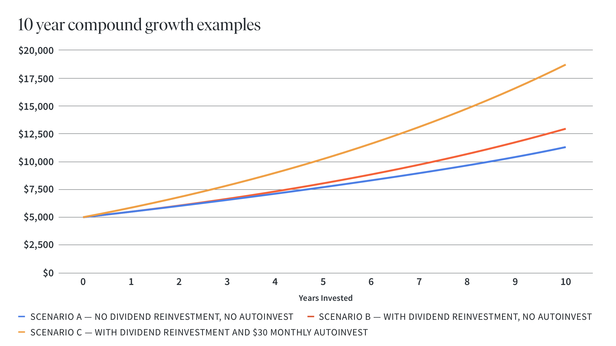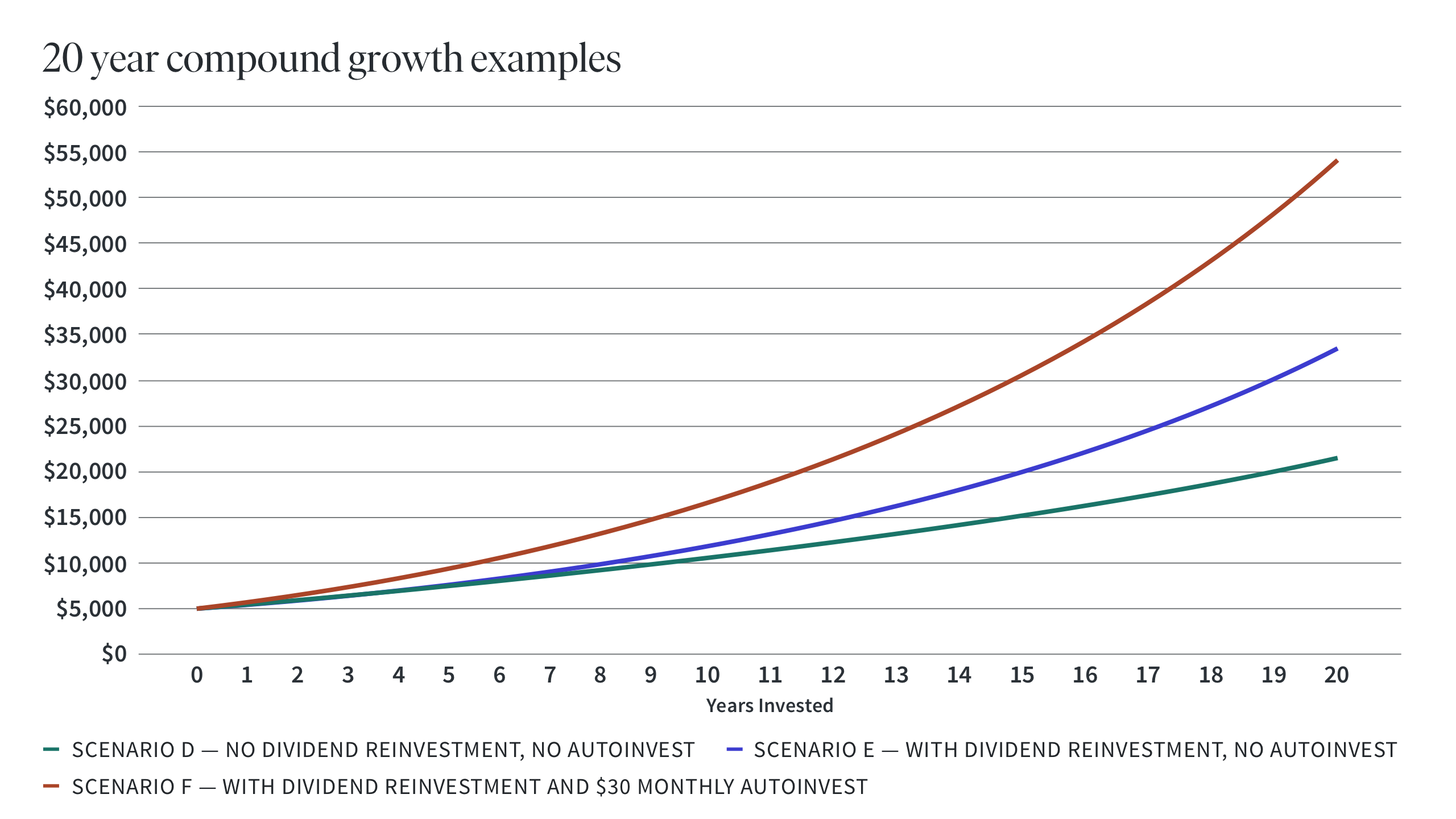 Autoinvest is still extremely powerful — it creates an affordable way to expose more principal to an investment over time, which ultimately results in more absolute dollars earned. But as this scenario shows, by comparison autoinvest illustrates how much more powerful compound growth — and the time required for compound growth to function — can be to the bottomline creation of returns.