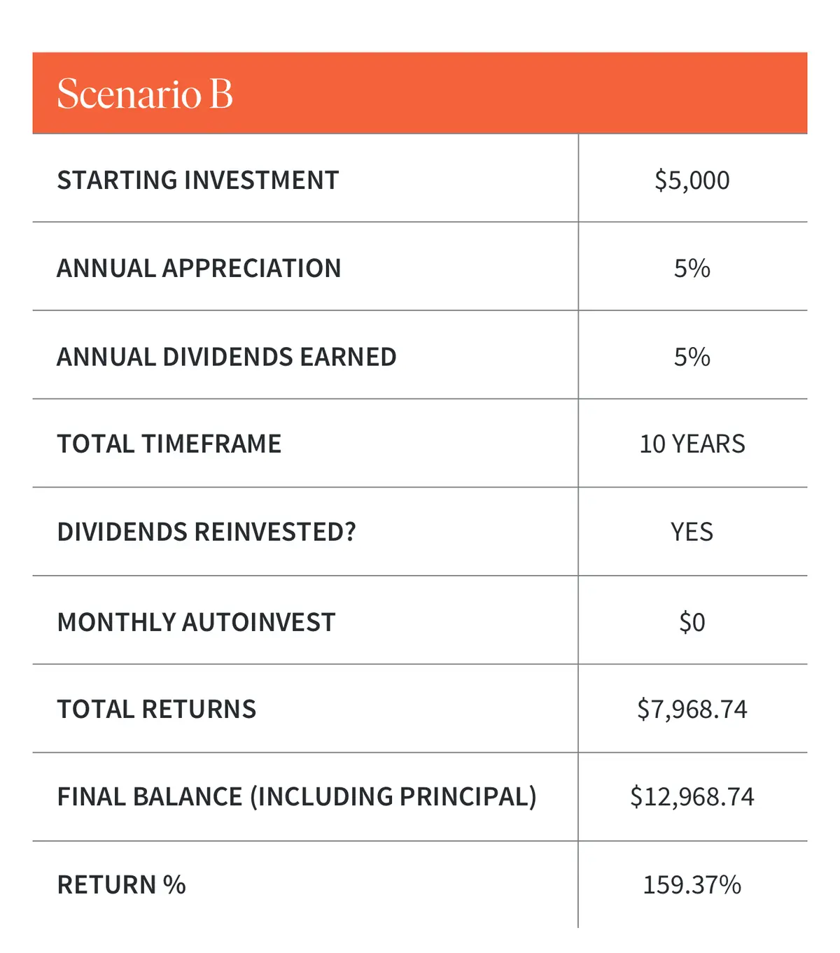 The effect is significant, and it begins to show just how critical the power of compounding can be. In this example, embracing dividend reinvestments results in a return of about $7,968, roughly 159% — a healthy improvement over Scenario A, where dividends were not reinvested.