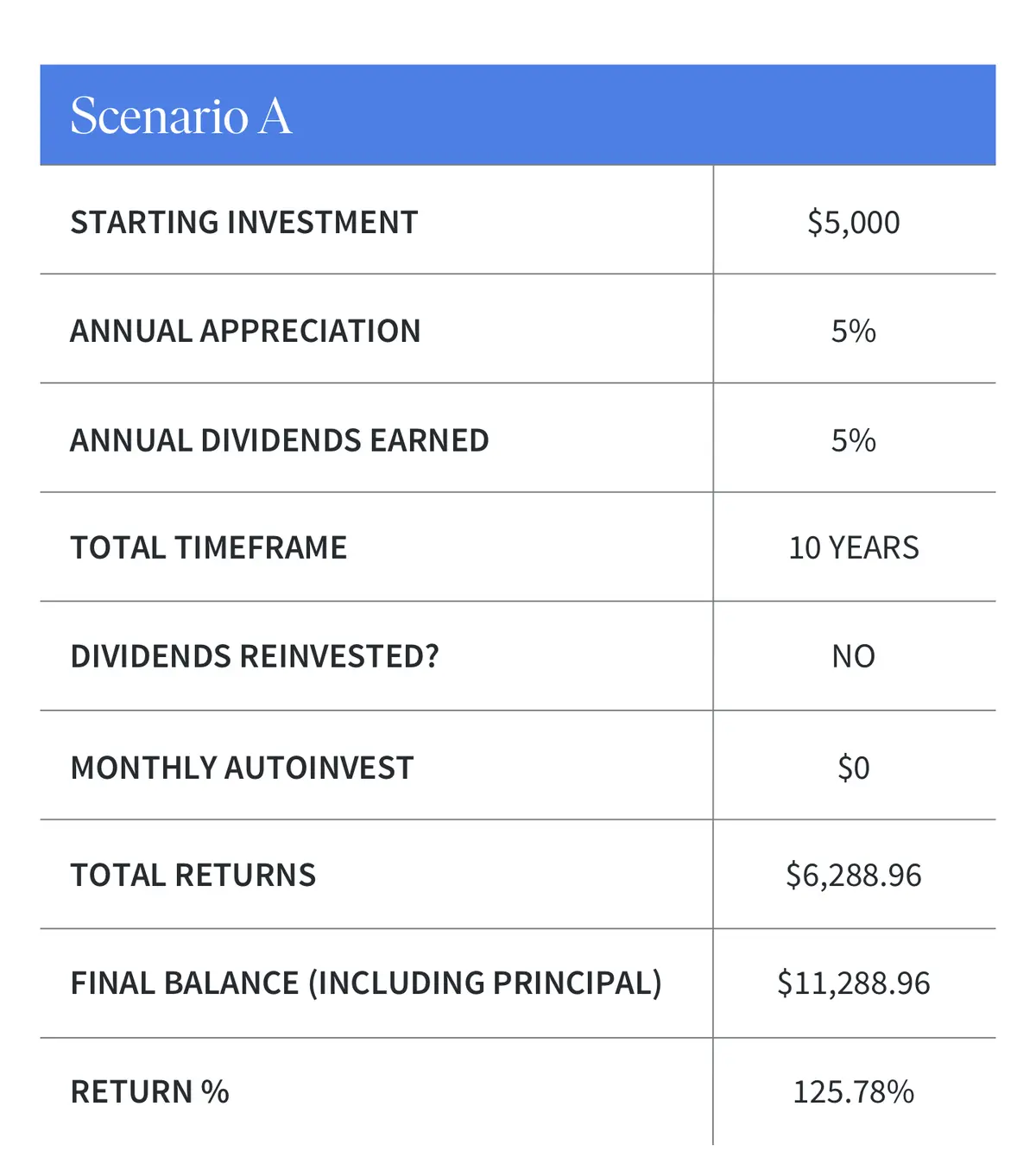 This is the simplest scenario we’ll look at — $5,000 invested and left to grow uninterrupted for 10 years. Each year, half of the annual 10% return is left to compound (the appreciation), while the other half is collected by the investor and does not contribute to future growth (this investor does not have dividend reinvestments turned on).