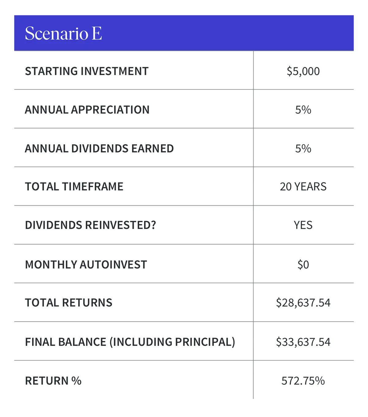 Scenario E is where the full potential of compounding really becomes apparent. Simply by turning on dividend reinvestment and allowing the full 10% annual return to compound over the entirety of the 20 year investment, our simulated investments (and unrealistically consistent performance) pocket a 572.75% return — or, $5,000 returns roughly $28,837, with no additional principal required.