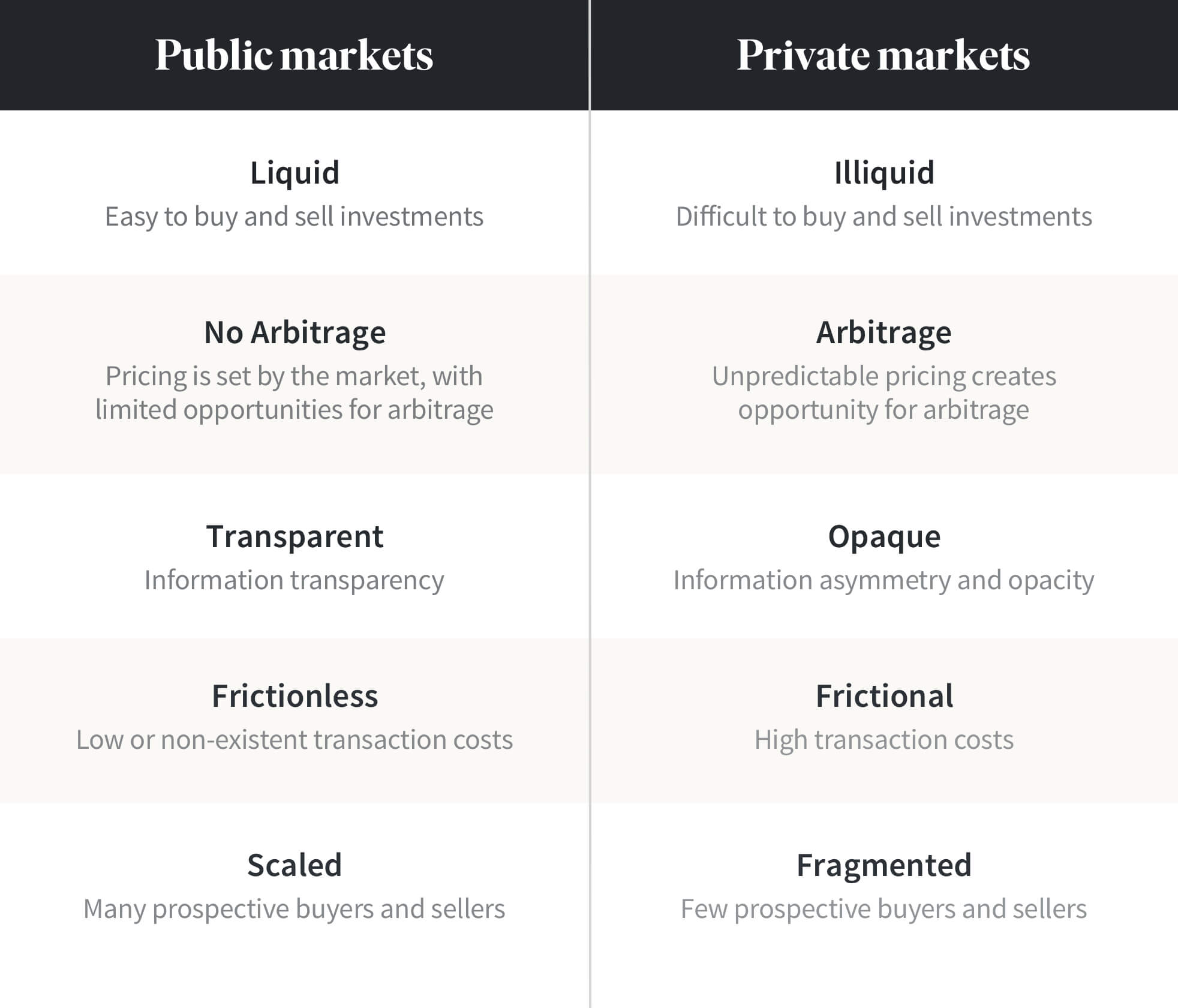 While these market dynamics may seem unfavorable, they are actually potentially more favorable to investors. That’s because whereas the market sets prices in the efficient public market, there’s room for negotiation between the buyer and seller in the inefficient private market. With fewer buyers and sellers participating in the market, and with information unequally shared, the market doesn’t necessarily set the price of the asset, giving investors a greater chance to “beat the market” in a way that isn’t possible to do on a consistent basis in the public market.