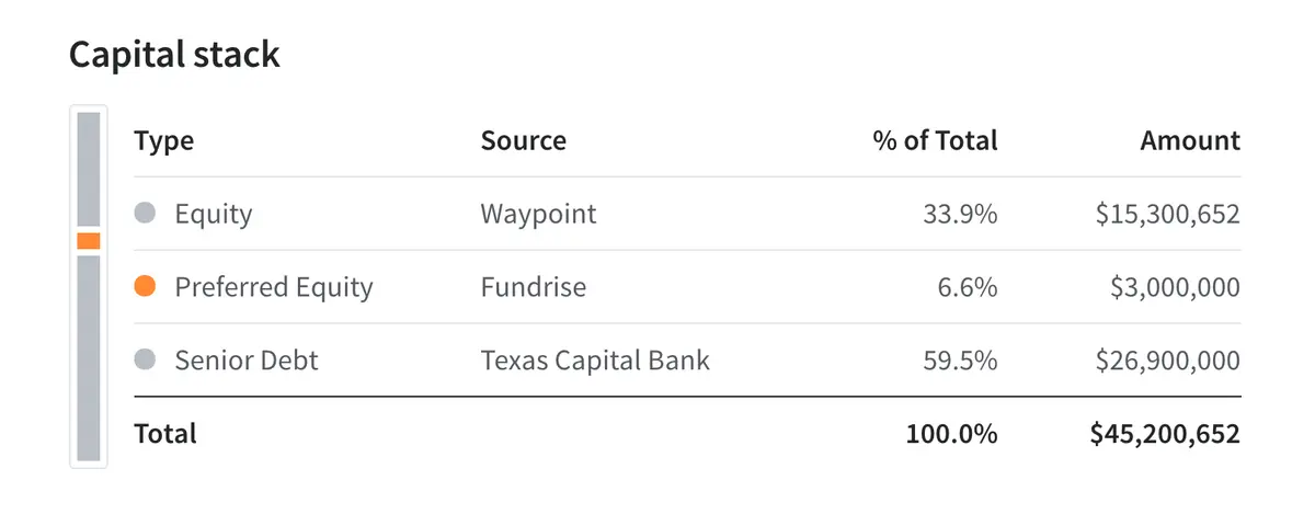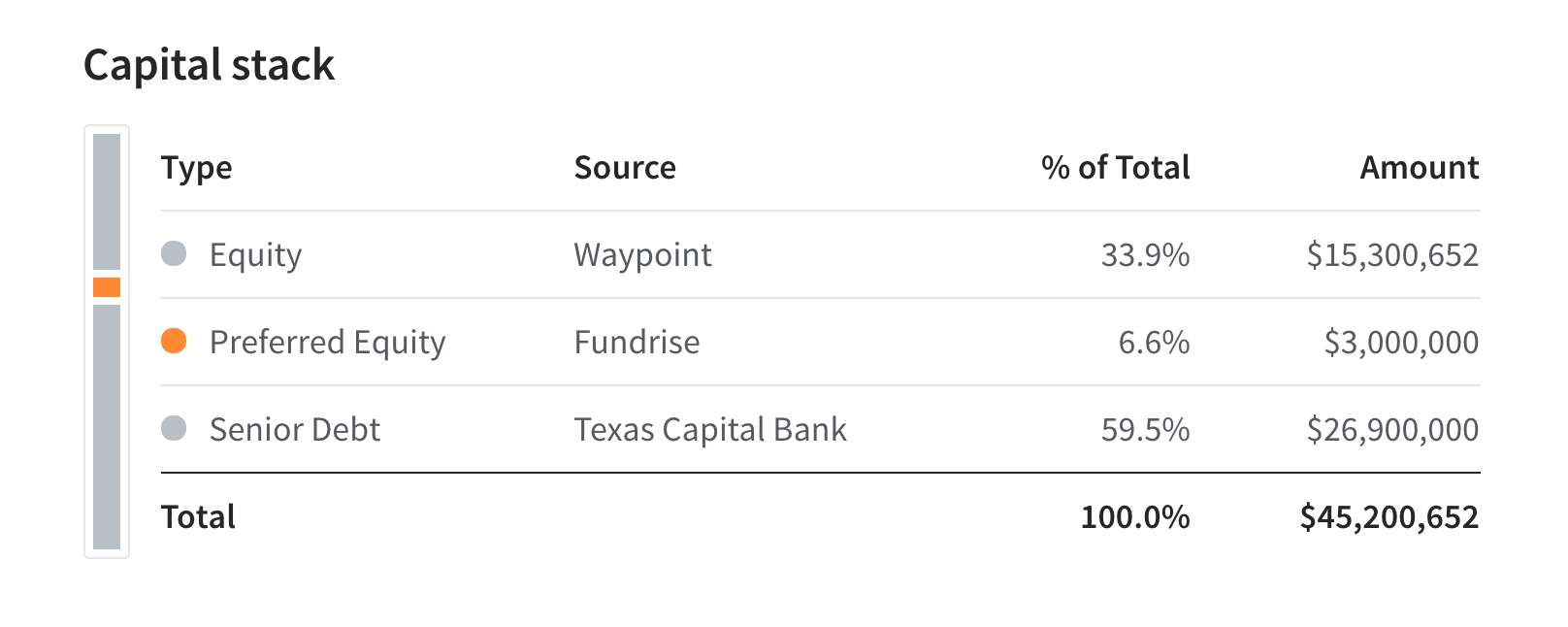 As part of every property’s profile on our platform, we provide an overview of that deal’s capital stack, with details on Fundrise’s position in relation to other capital sources, the amount each source has invested, and the % of the total deal that that amount represents.