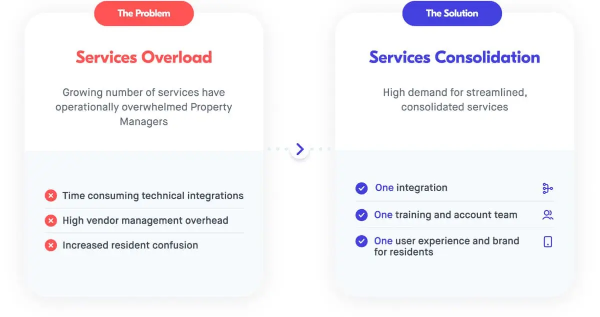 As has happened in many other industries which are early on in terms of being transformed by technology, the real estate world has seen a proliferation of “point solutions” — software products which only do one thing. While innovation in the space is welcomed and exciting, the downside of so many point solutions is services overload, the burden imposed on a business by having to make a purchase decision, negotiate a contract, set up and maintain integrations, and train team members on a different software system for each function in their business.