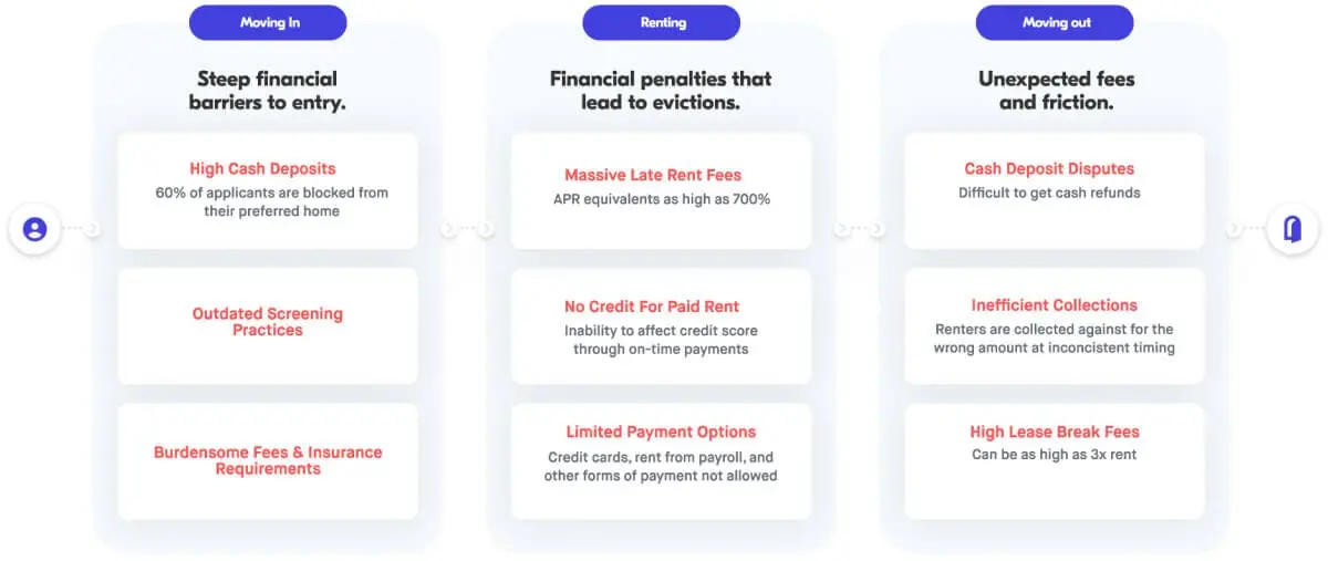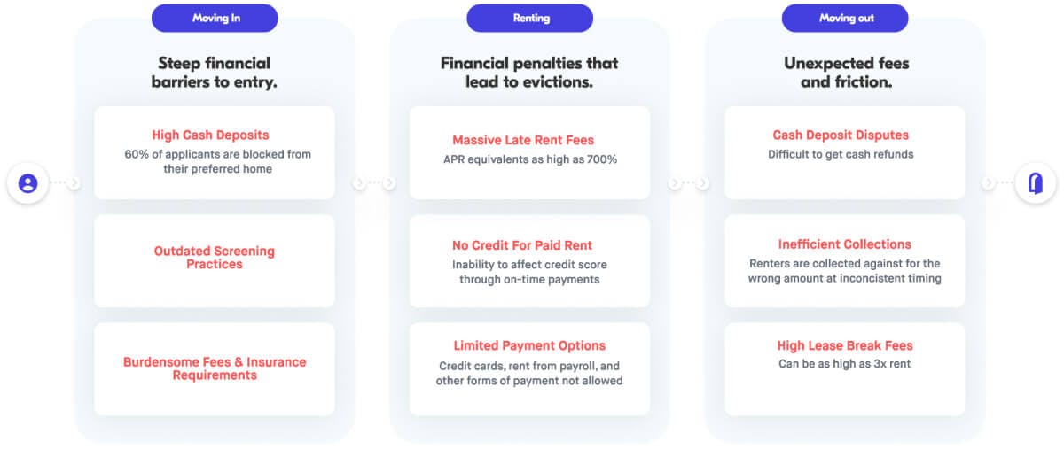 The tenant-facing financial services of rental real estate are largely still stuck in the last century. From requiring a full month’s rent as a security deposit, to inflexible rent payment terms with massive late fees, these outdated practices place increasing burden on tenants, in many cases without meaningfully improving outcomes for owners. Exacerbating this is the fact that rent growth has far outpaced wages, especially in high-growth, high-demand markets.