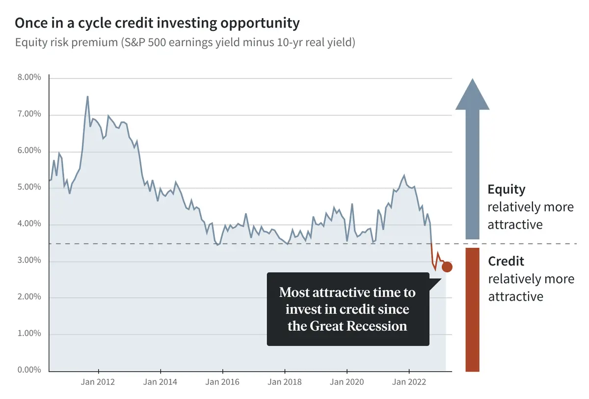 Over the past 15 years, the global financial markets have experienced a period of record low interest rates and generally accommodative monetary policy. During this time debt has been relatively inexpensive, and borrowing has been readily available. As a result, up until mid 2022, equity has generally been the more attractive investment class, with the equity risk premium (a measure of the expected additional return one would earn from investing in equities above and beyond treasuries) maintaining one of its largest spreads over the past 20+ years.