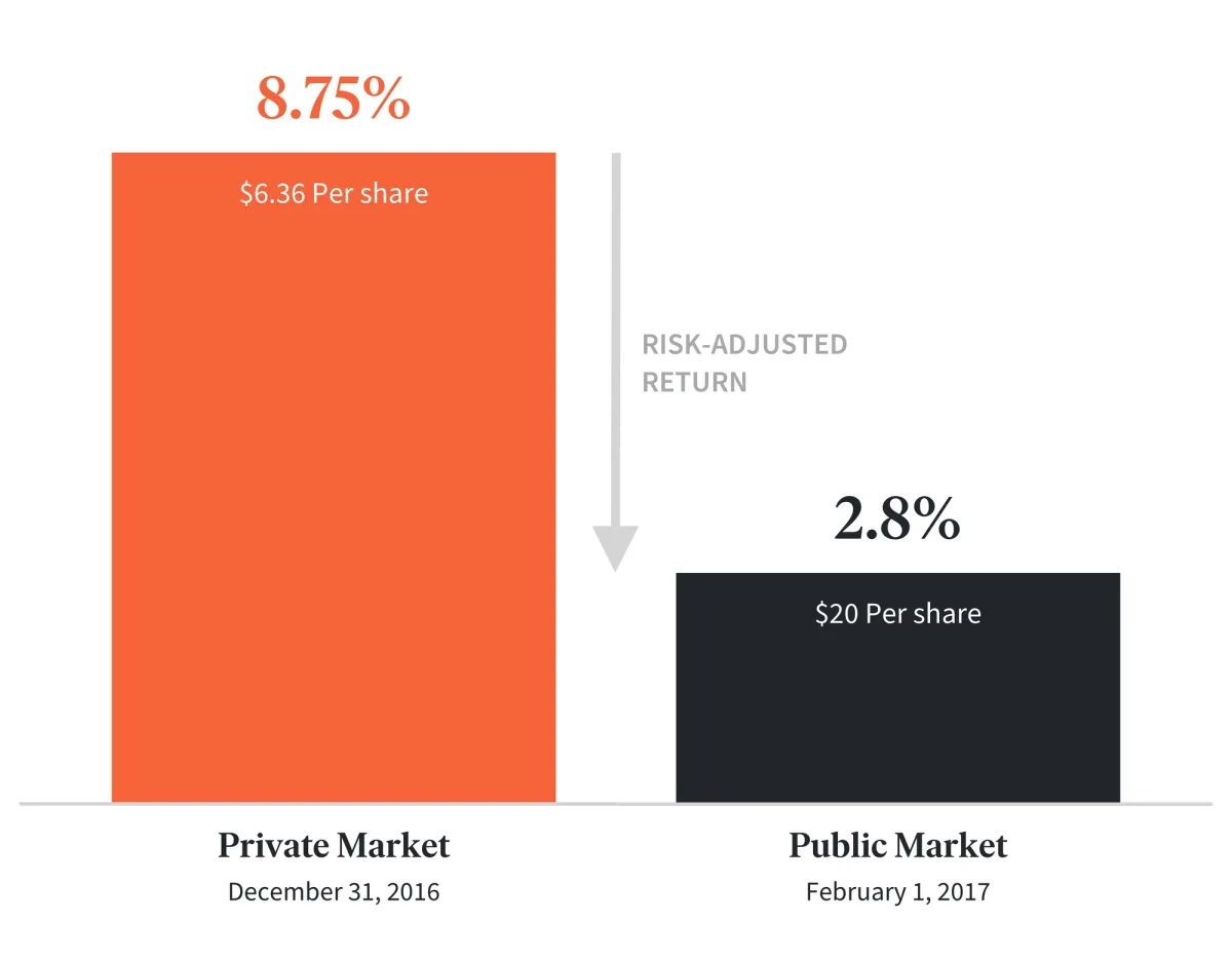 Here’s a demonstration of the public market premium: Blackstone, a private equity fund, listed Invitation Homes, a portfolio of single-family rental homes, on the New York Stock Exchange in February 2017. Share prices of Invitation Homes rose from $6.36 per share to $20 per share and returns fell immediately upon moving from the private to the public market from 8.75% to 2.8% annualized. Public market investors paid higher costs and earned lower returns for the same investment than investors who purchased shares the private market due to the liquidity premium.