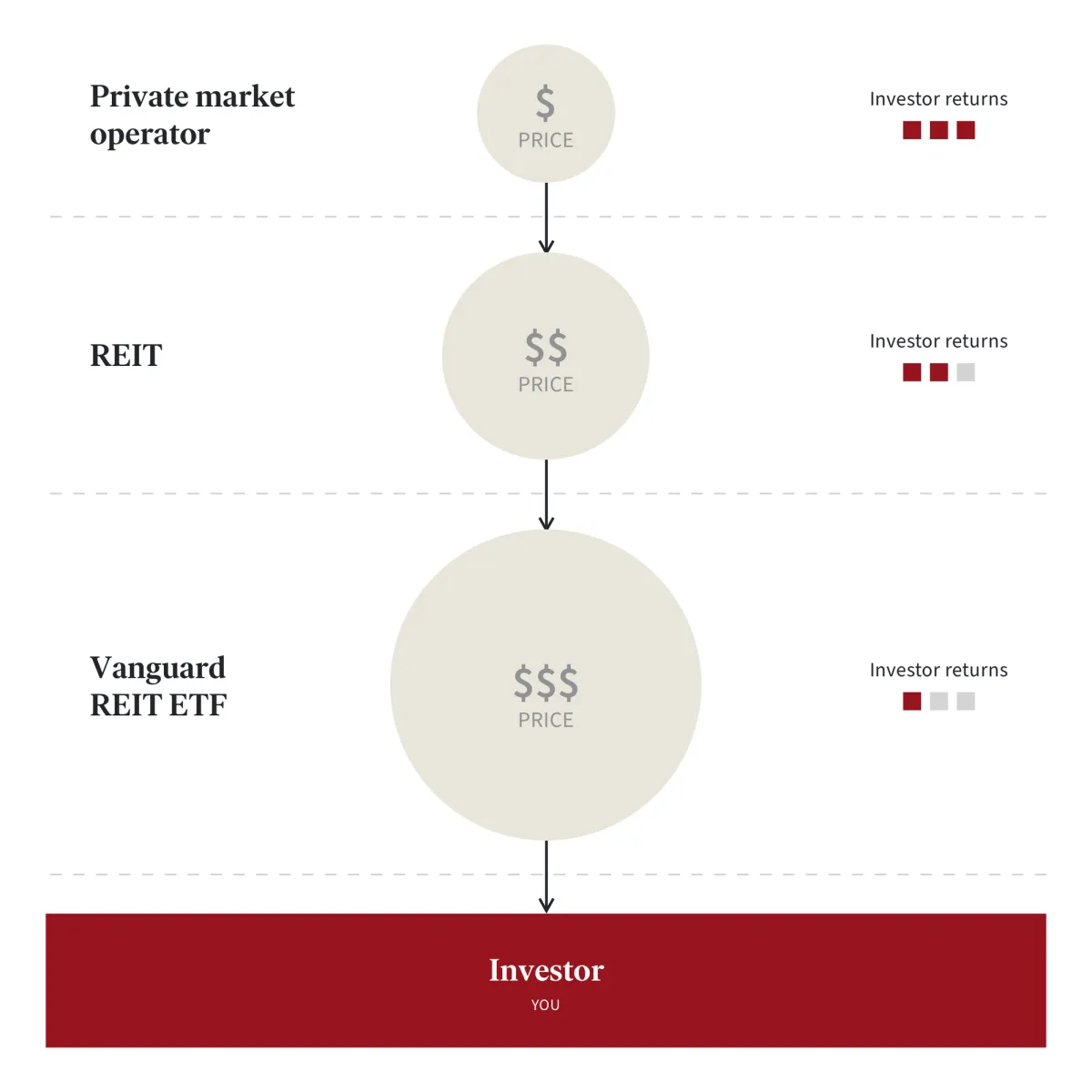 By the time that a real estate investment opportunity moves from the private market player at the beginning of the value chain to the individual investor at the end, its earning potential has diminished for the end investor, as it has already incurred several sets of fees, expenses, and markups. Overall, the individual investor at the end of the value chain buying shares of the Vanguard REIT ETF buys at the advertised retail price — not at the wholesale price that is available earlier in the supply chain — earning the lowest return at the most inflated investment price.