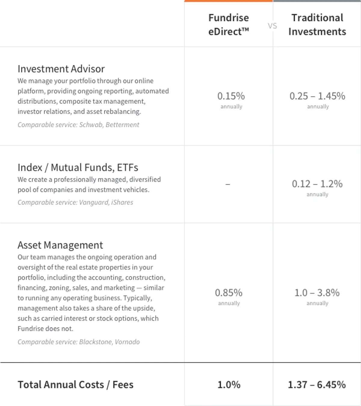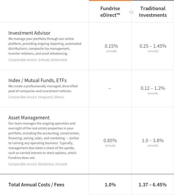 Only in a skin-deep analysis does Vanguard appear to offer a lower-cost option than Fundrise. When analyzed more thoroughly, an analysis of Vanguard reveals a broad swath of fees and costs innate in the public market investment system, which are absent from the Fundrise investment model.