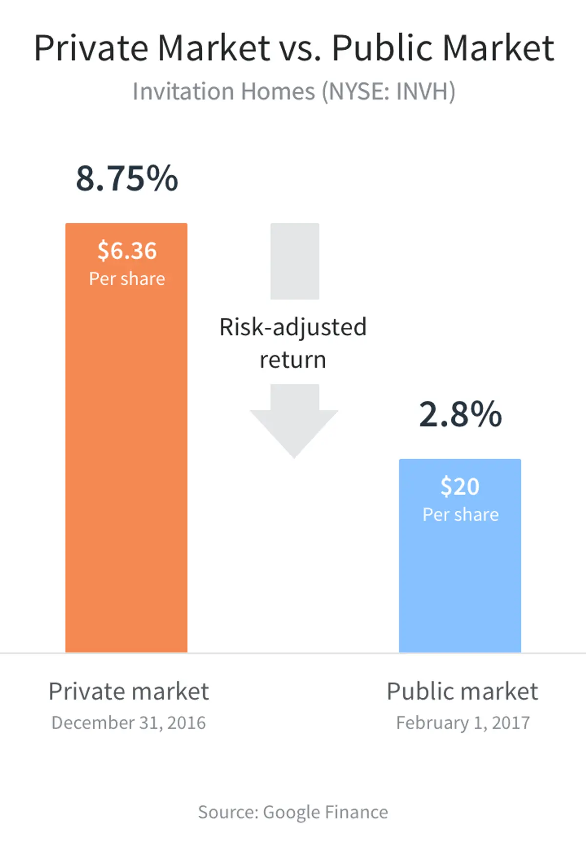 Earlier this year, Invitation Homes (stock ticker “INVH”), a Blackstone-owned portfolio of single family rental homes, filed its initial public offering on the NYSE. The price of a share in the IPO was $20—a 215% increase from the $6.36 per share book value it had disclosed only two months prior to its IPO.