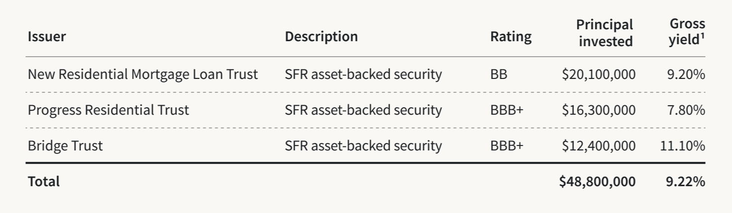 The Income Real Estate Fund holds a roughly $48.8 million portfolio of single-family rental asset-backed securities (ABS) across three issuers, for a weighted average gross yield of approximately 9.2%.