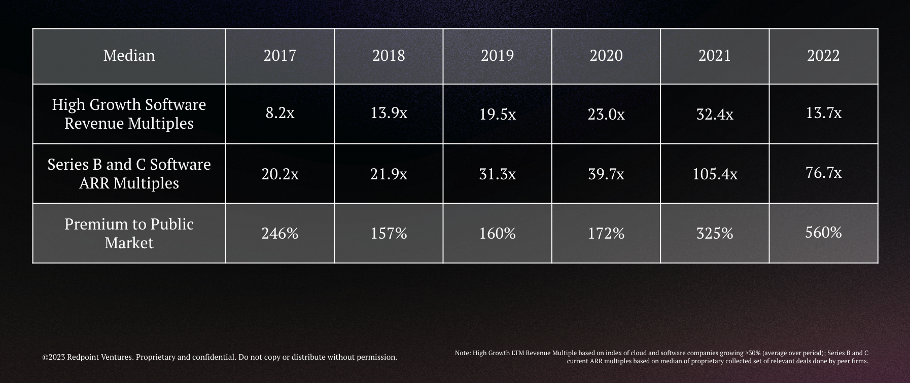 Below is a table from the folks at Redpoint Ventures comparing revenue multiples of public software companies to private software startups.