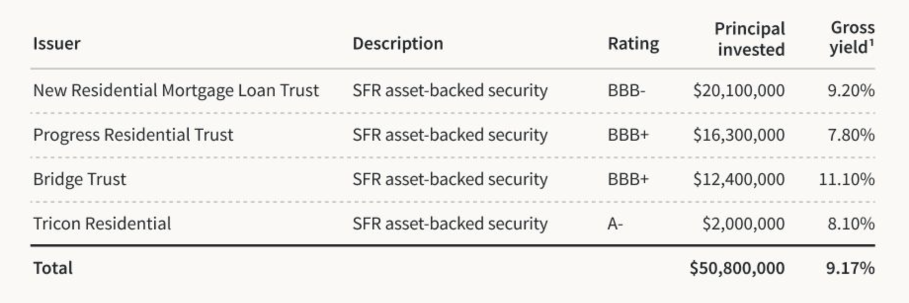 The Income Real Estate Fund began purchasing ABS and homebuilder bonds at the end of last year, and we plan to continue to manage this portfolio on an ongoing basis as long as the current dynamic of pricing dislocation in credit markets exists. We believe this period of exceptionally attractive pricing is temporary and most acute in primary auctions. As before, we intend to focus on ABS pools issued by the most creditworthy borrowers and where the collateral (i.e., the portfolio rental homes) consists of high-quality homes in strong locations that we might otherwise be buyers and owners of in our other funds over the long-term.