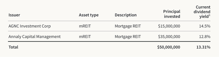 The Income Real Estate Fund has initiated a position (bought securities) in AGNC Investment Corp, a publicly-traded mortgage REIT, and has increased its position in Annaly Capital Management, bringing the total portfolio cost-basis to approximately $50 million in invested principal as of August 31, 2023. (Note: Invested principal does not include any mark-ups or write-downs as a result of market changes.)
