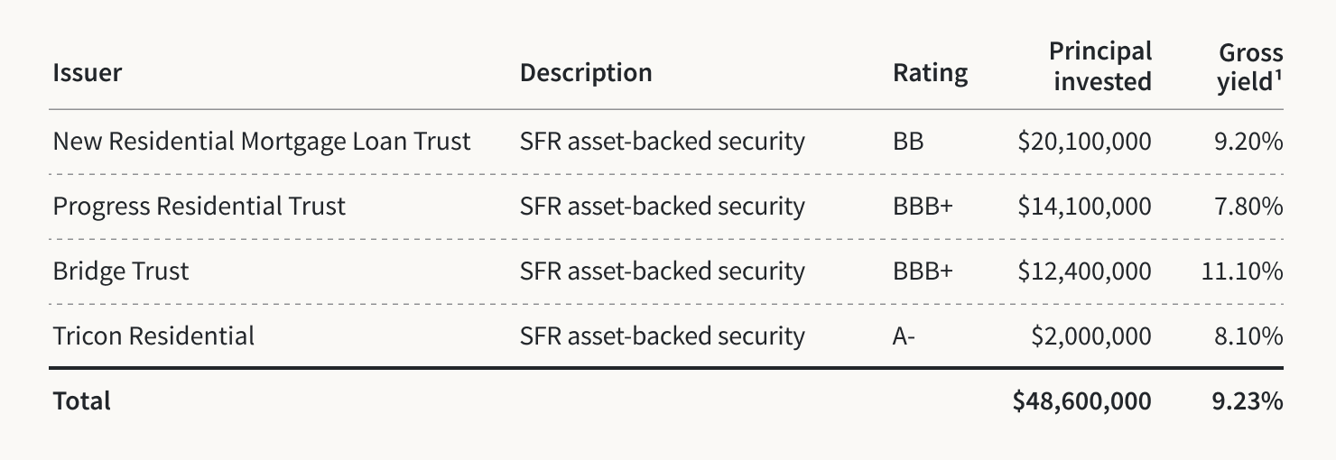 The Income Real Estate Fund began purchasing ABS and homebuilder bonds at the end of last year, and we plan to continue to manage this portfolio on an ongoing basis as long as the current dynamic of pricing dislocation in credit markets exists. We believe this period of exceptionally attractive pricing is temporary and most acute in primary auctions. As before, we intend to focus on ABS pools issued by the most creditworthy borrowers and where the collateral (i.e., the portfolio rental homes) consists of high-quality homes in strong locations that we might otherwise be buyers and owners of in our other funds over the long-term.