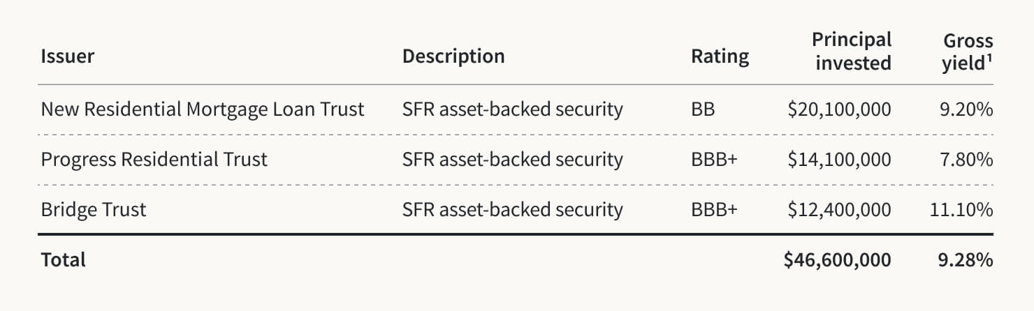 The Income Real Estate Fund began purchasing ABS and homebuilder bonds at the end of 2022, and we plan to continue to manage this portfolio on an ongoing basis as long as the current dynamic of pricing dislocation in credit markets exists. We believe this period of exceptionally attractive pricing is temporary and most acute in primary auctions. As before, we intend to focus on ABS pools issued by the most creditworthy borrowers and where the collateral (i.e., the portfolio rental homes) consists of high-quality homes in strong locations that we might otherwise be buyers and owners of in our other funds over the long-term.