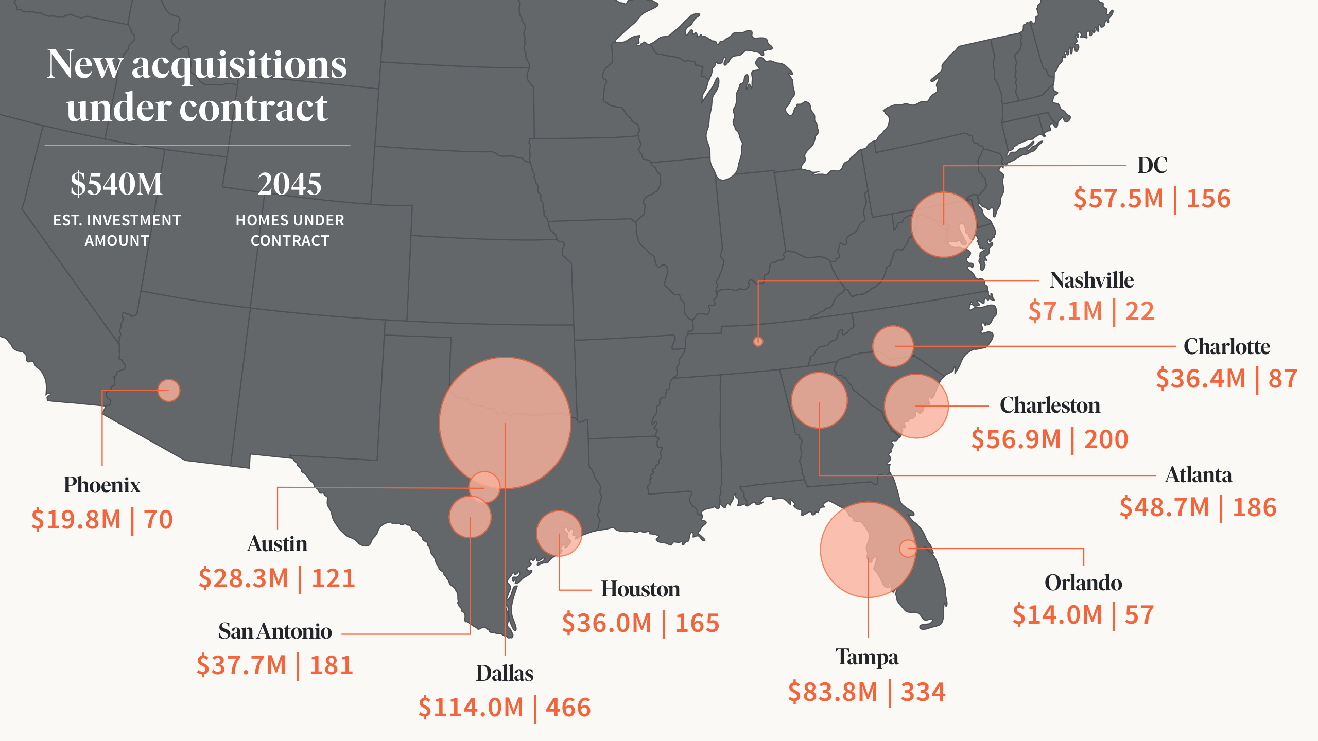 The majority of our current portfolio and pipeline includes homes that we have bought or intend to buy directly from the homebuilder when they deliver. To diversify our approach and help ensure a healthy pipeline of new homes to add to the portfolio, we’re also starting to invest directly in the construction of these homes. The first example of this new approach is a 5-acre property in Houston that we recently acquired for roughly $16.2 million, with plans to spend an additional $12.5 million to build 78 townhomes on the site. We expect these homes will deliver over the next 14 months, creating another stream of homes in our pipeline.
