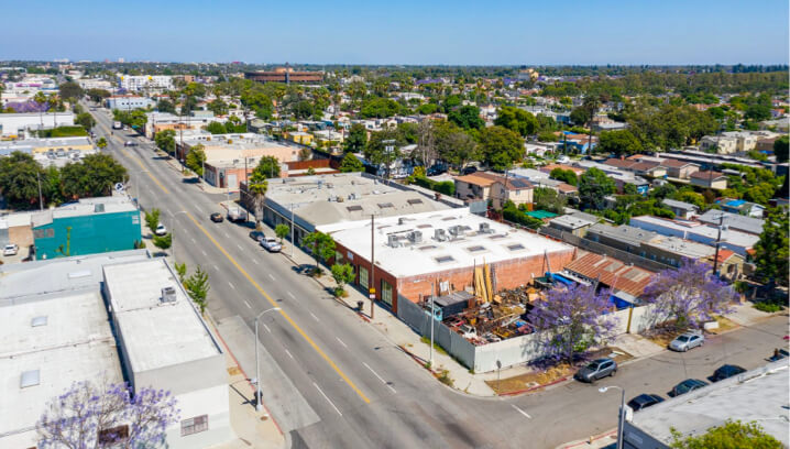 An aerial view of West Jefferson Boulevard in Los Angeles, where Fundrise is renovating office and retail space.