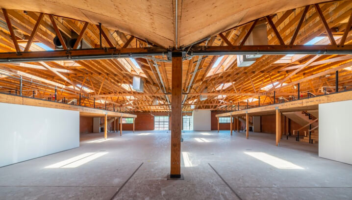 In an expansive brick building that once housed a child-care center before reverting to a warehouse, an inside-out renovation for a future food hall has stripped the wooden ceiling down to gorgeous bow trusses, sunlight filtering through the gaps and lighting up a floor of dirt filled with tracks from heavy machinery.