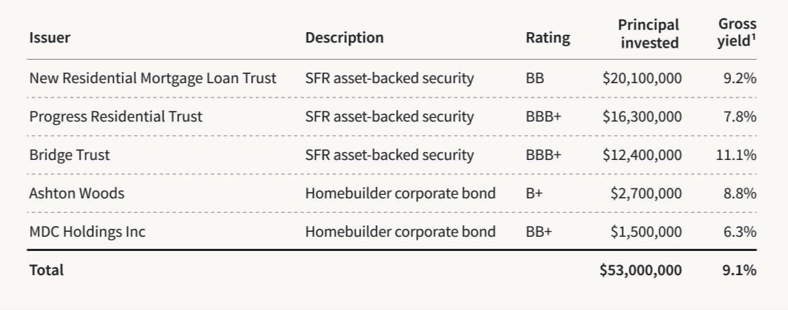 The Income Real Estate Fund holds a roughly $53 million portfolio of single-family rental asset-backed securities (ABS) and homebuilder corporate bonds across five issuers for a weighted average gross yield of 9.1%.