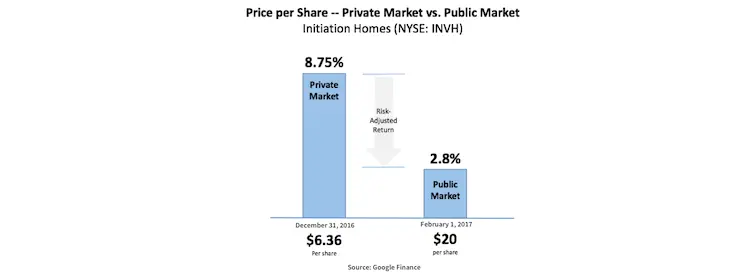 Blackstone illustrates the valuation benefits of capitalizing on the price differential between the private and public markets. With approximately $170 million of free cash flow (net income after debt service) as of 2016, the public markets priced Invitation Homes at a substantial premium above their private market basis.