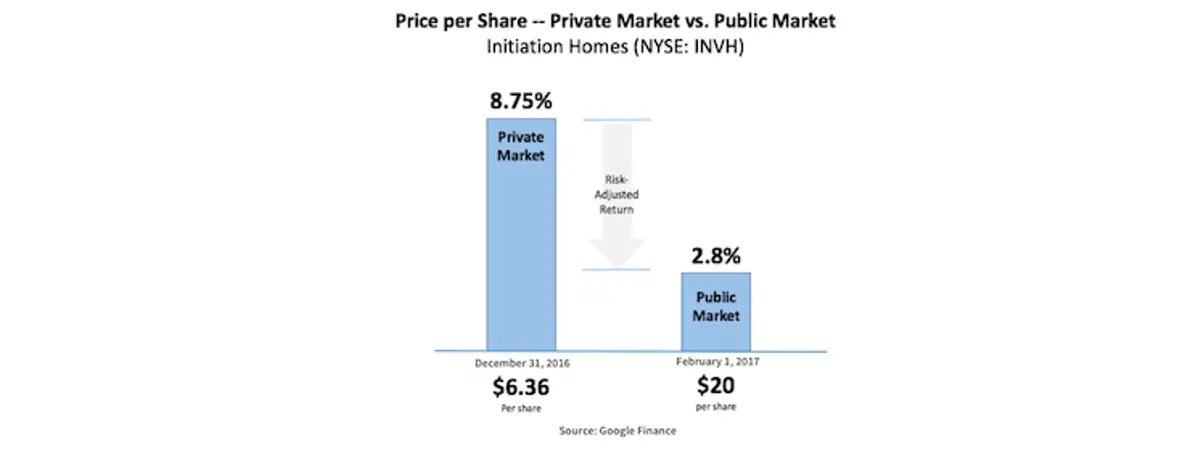 The IPOs of Invitation Homes and its cohorts exemplify the pronounced pricing differential between public and private markets. By going public, companies are able to significantly boost their valuations over book – a benefit to entrepreneurs, but one that comes with profound implications for post-IPO, public market investors.