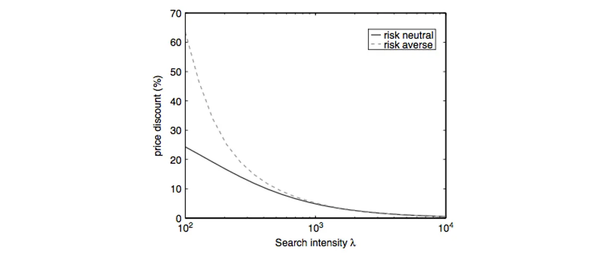 The graph provided by Duffie et al shows how the proportional price reduction relative to the perfect-market price decreases as a function of the search intensity λ.³⁹ The solid line plots this illiquidity discount when investors are risk neutral and may face holding costs, where the holding costs are calibrated to match to utility costs in a model with risk-averse investors and time-varying hedging demands, as illustrated by the dashed line.⁴⁰
