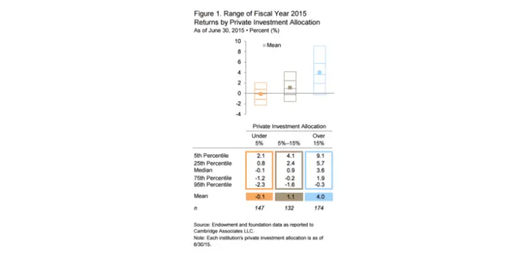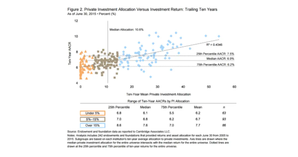The impact of the private vs. public yield spread on individual investors can be elucidated by examining the differential returns between institutions with high allocations to private investments and those with low allocations to private investments. A study by Cambridge Associates found that, for the fiscal year ended June 30, 2015, the median annual return for institutions with more than 15% of AUM in private investments was 370 basis points above that realized by institutions with less than 5% of AUM in private investments.¹²